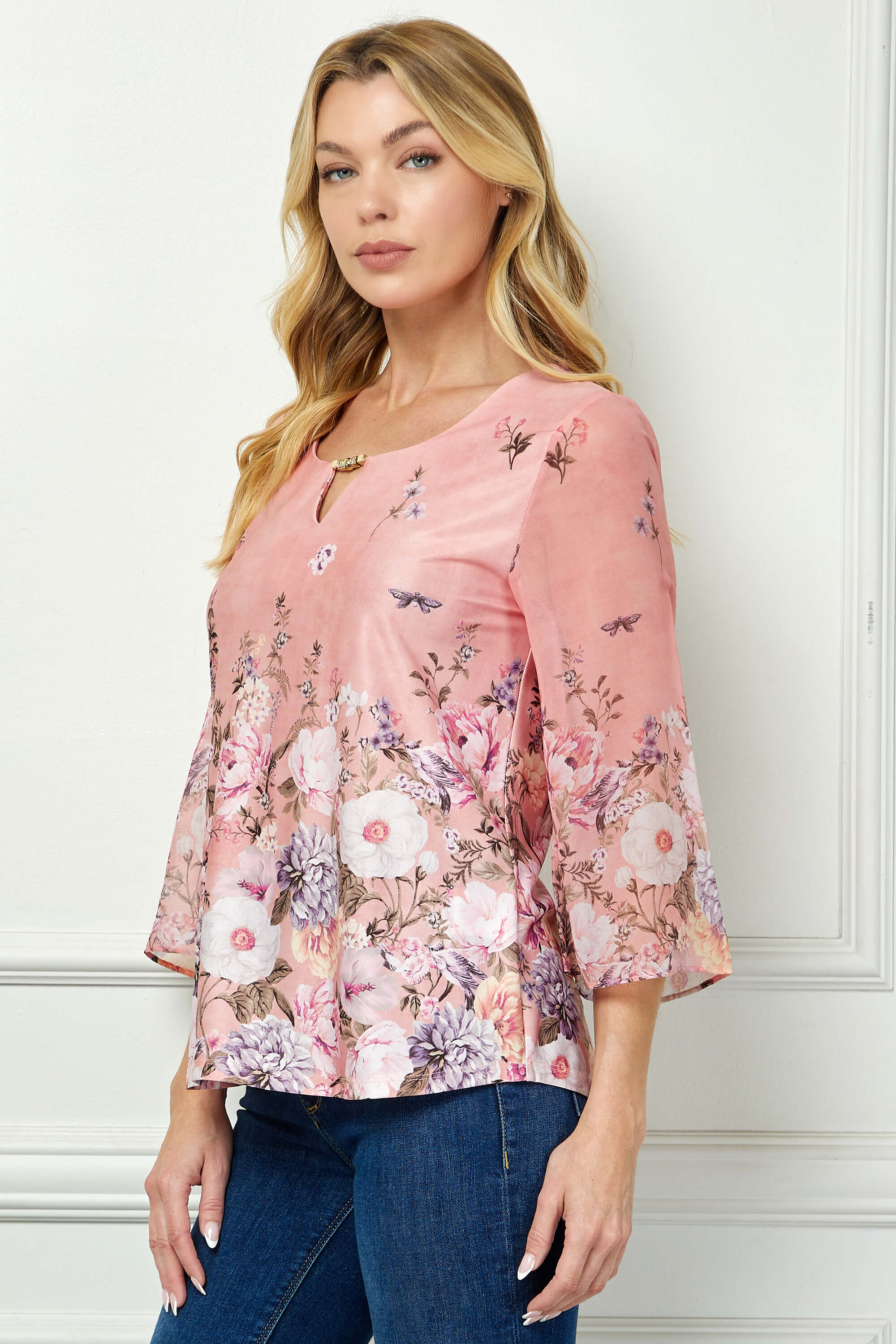 Graceful and eye-catching, this blouse blends elegant detailing with an easy, flattering silhouette. The cutout neckline adds a modern touch, while the border print design brings visual interest and a refined finish.