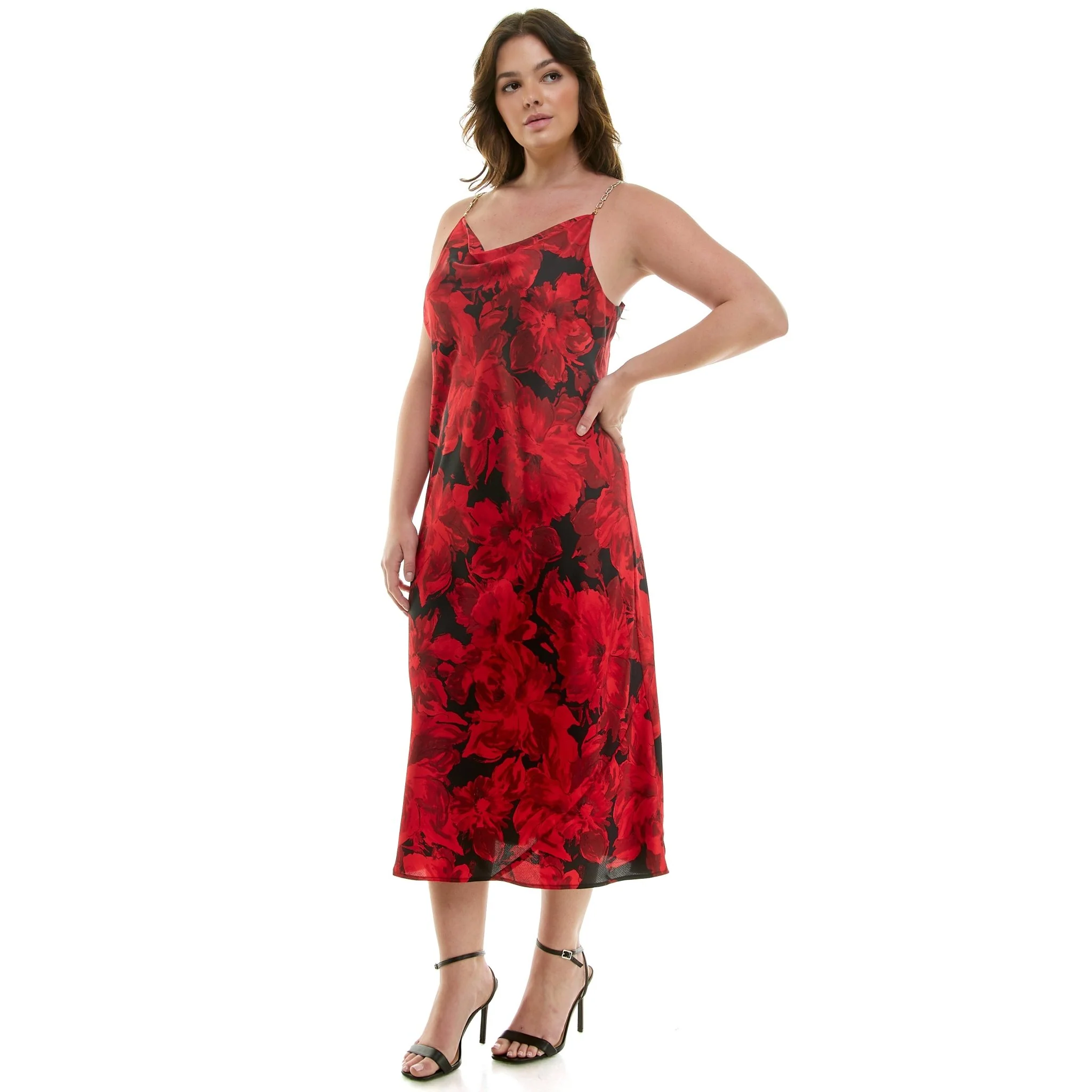 Detachable Chain Trim Strap Cowl Neck Dress, Black & Red - Plus