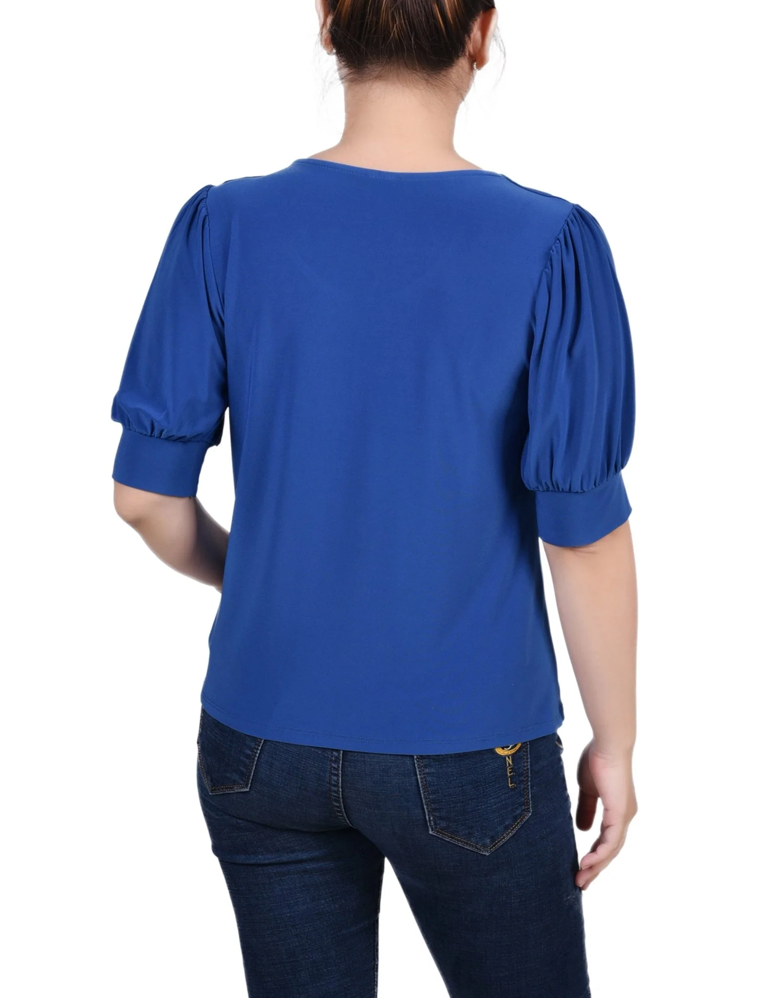 Add a little flair to your day with this NY Collection puff sleeve knit top with wide cuffs and neck hardware. You can pair this top with your favorite jeans for a more casual look. You can pair it with a pair of dress pants or skirt for work. You can even dress it up for the evening! The fabric is a soft knit jersey and can be thrown into the washer and dryer for an easy-care piece that will last from season to season.